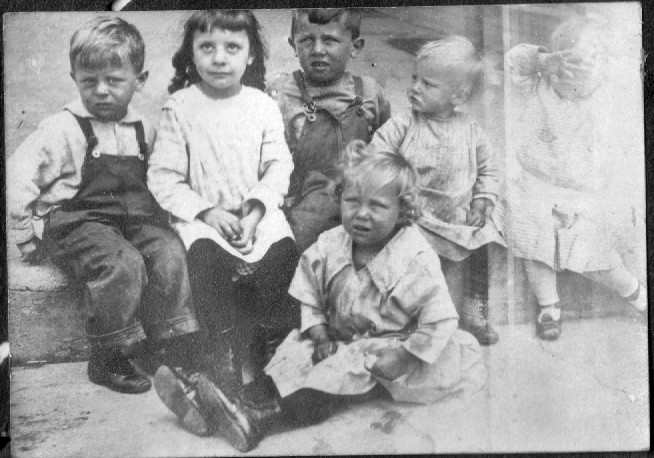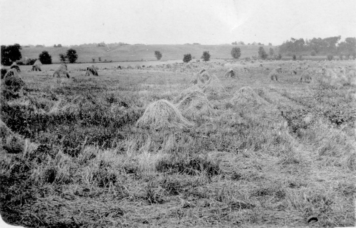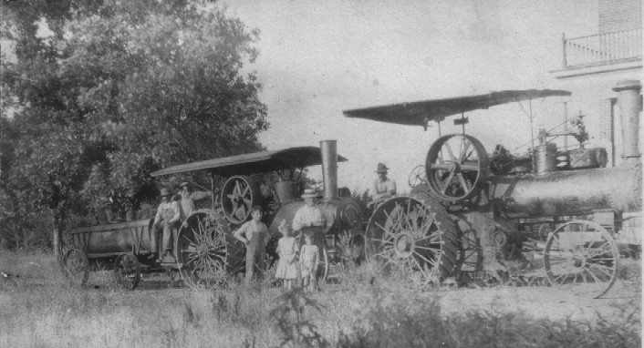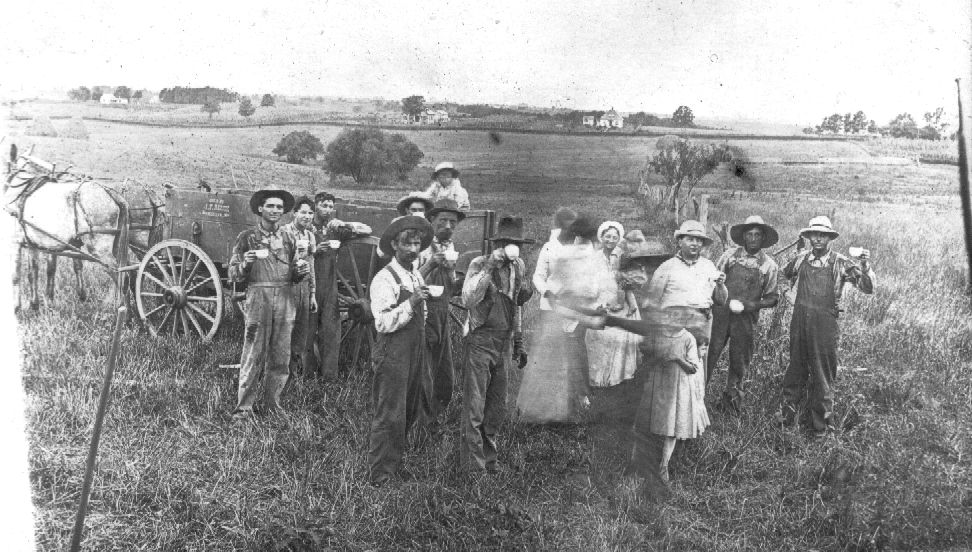 dirty threshing crew. Lady in light colored bonnet and child on hip